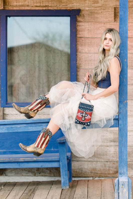 The Chic Bag crossbody handbag showcases vibrant American colors with a distinctive cross and wing pattern, inviting you to carry it your way—whether around the waist, slung over the shoulder, or as a chic wristlet. It features a convenient open sleeve pocket on the outside and two interior pockets: a roomy main compartment and a smaller one for essentials. Measuring 6x8x1 inches, this bag combines bold style with practical versatility.